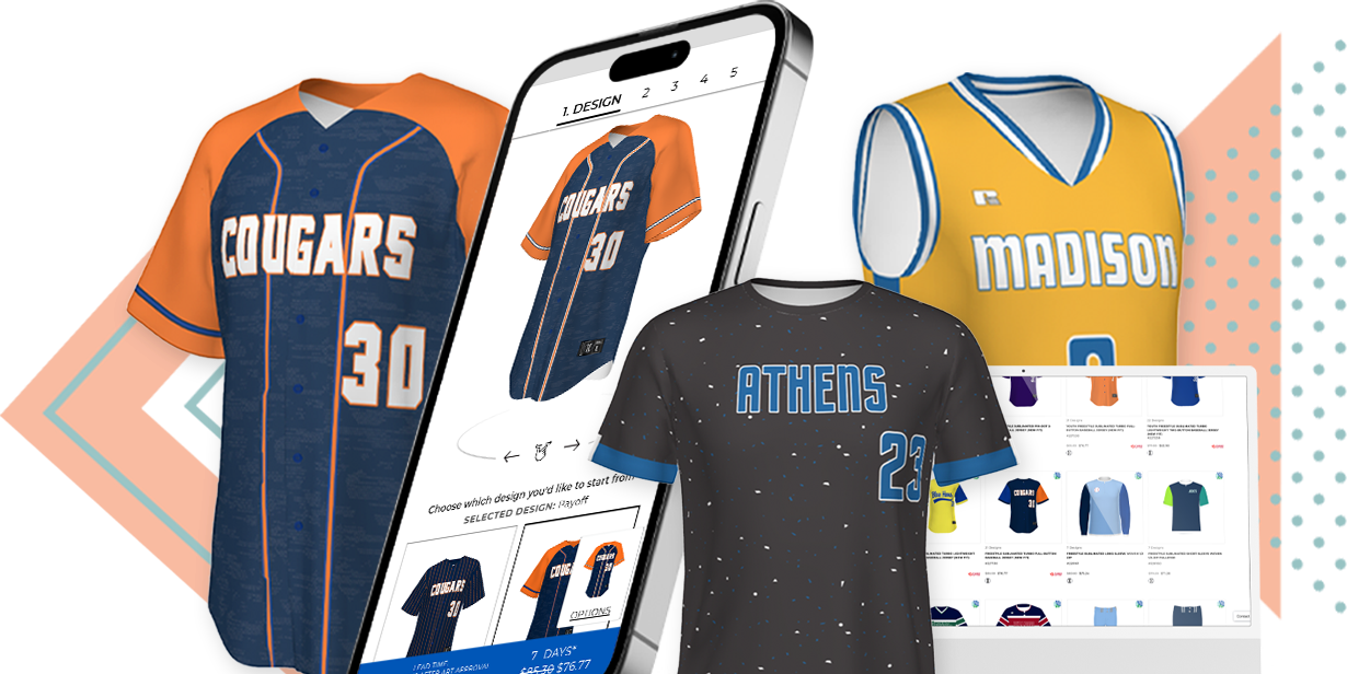 Design Full-Color Uniforms & Teamwear in Minutes. Get Started 15-Day Turnaround *after order/art approval 7-Day Rush *on select styles No Minimums SELECT A CATEGORY SHOP ALL BASEBALL HOCKEY TRACK/XC COMPRESSION BASKETBALL LACROSSE VOLLEYBALL POLOS CHEER/DANCE SOCCER ACCESSORIES FLEECE FOOTBALL SOFTBALL FANWEAR